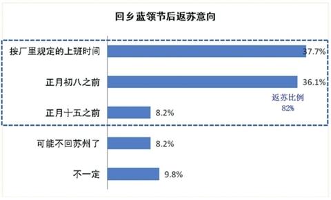 调研报告显示,在计划回乡群体中,有82%的在苏蓝领明确表示春节后会返回苏州工作,有9.8%的受访者还在犹豫,另外8.2%的受访者表示可能不会返回苏州工作。与去年相比,此次明确春节会返回苏州的群体明显增多(去年为59.4%)。