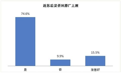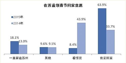 调研报告显示,此次在春节后计划返苏的蓝领中,有高达74.6%的选择节后会回原厂上班(去年为52.4%),9.9%在苏蓝领表示节后不会回原厂上班,15.5%在苏蓝领则表示“还没想好”。